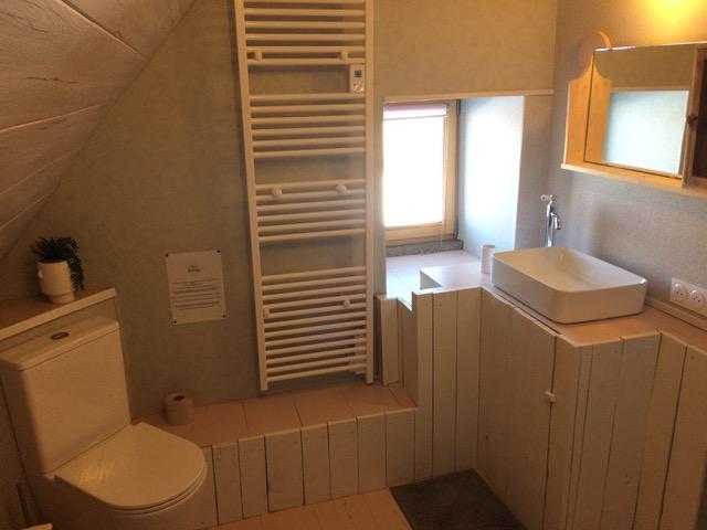 Une « salle d’eau des campeurs » (2 douches, 2 lavabos, 2 toilettes) est aménagée dans l’ancien fenil de la ferme.